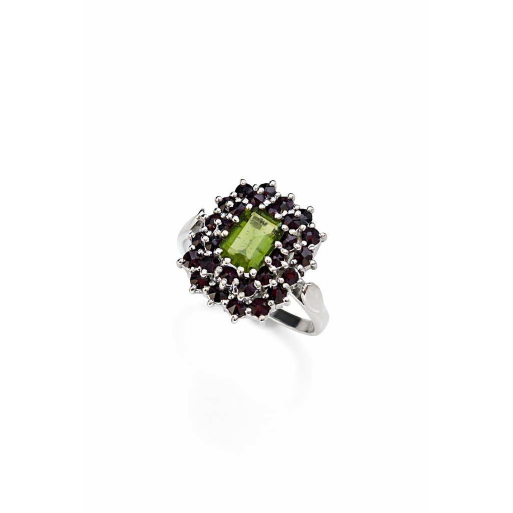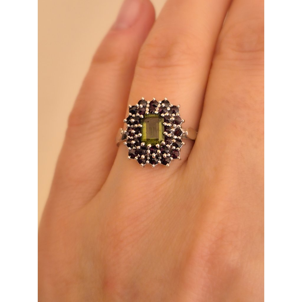 Stříbrný prsten s vltavínem a granáty P30 0076