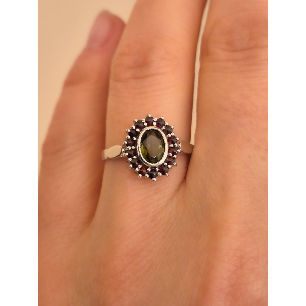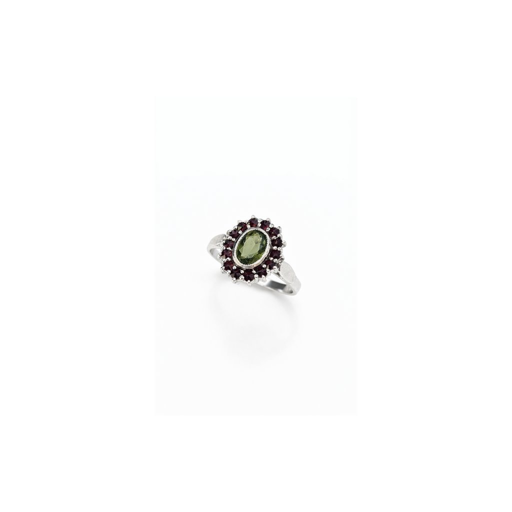 Stříbrný prsten s vltavínem a granáty P30 0084