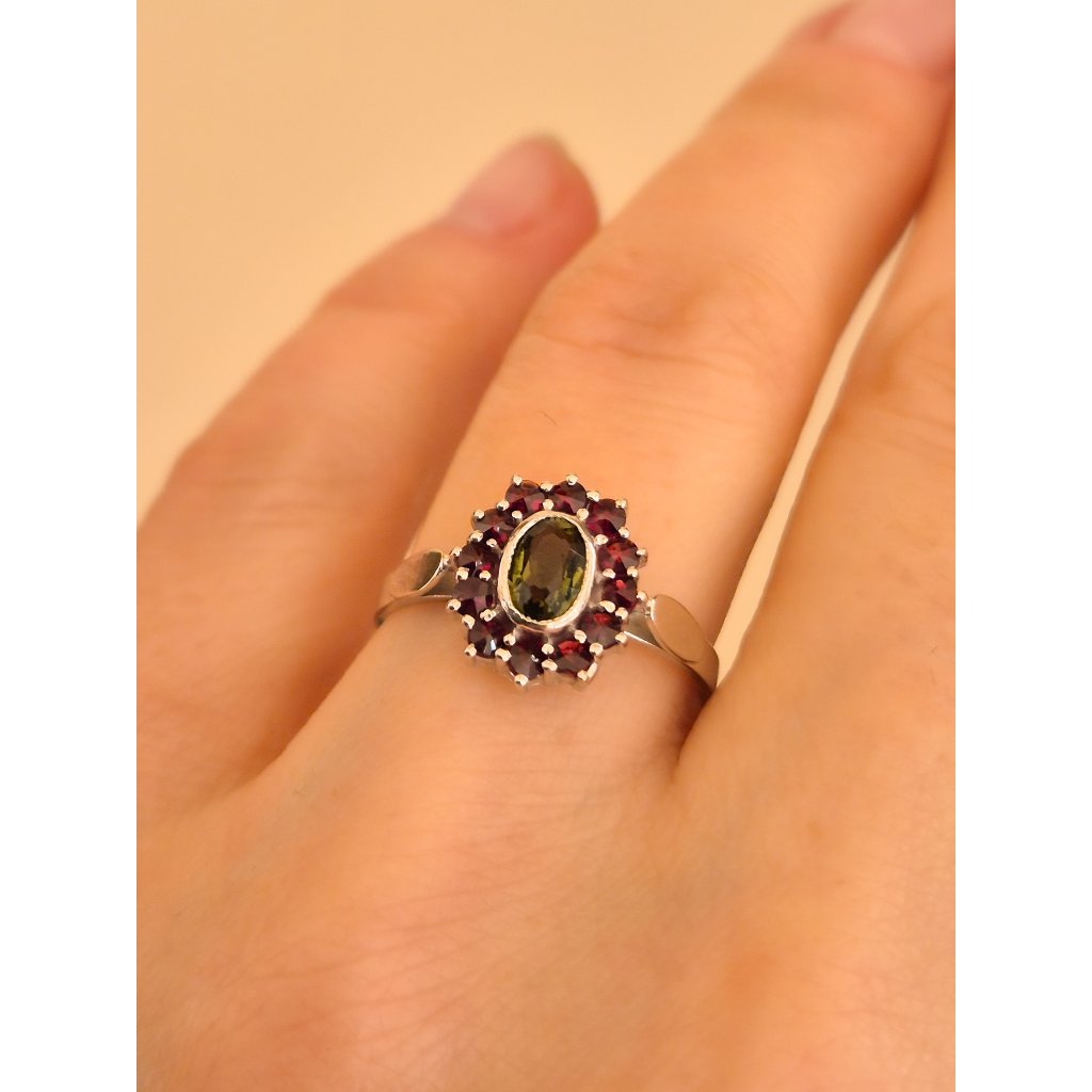 Stříbrný prsten s vltavínem a granáty P30 0087