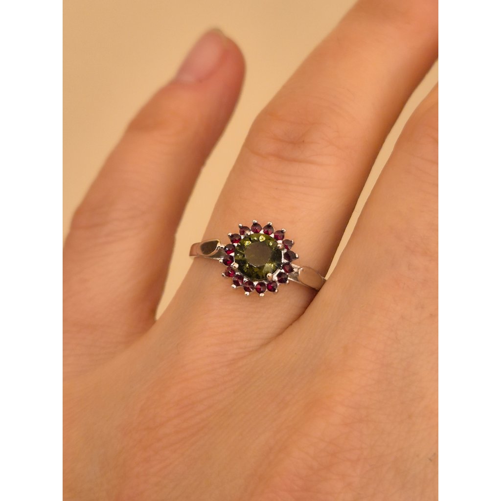 Stříbrný prsten s vltavínem a granáty P30 0089