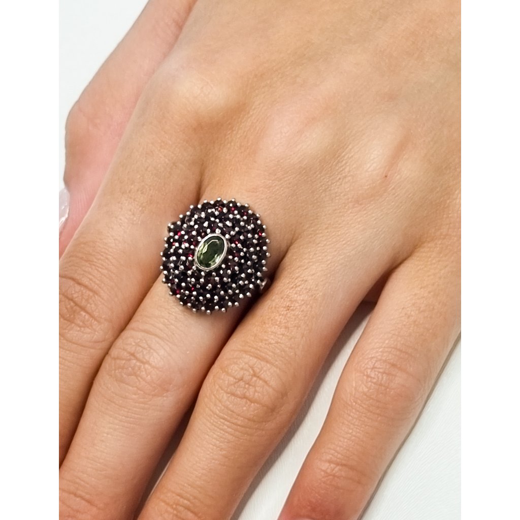 Stříbrný prsten s vltavínem a granáty P45 0005