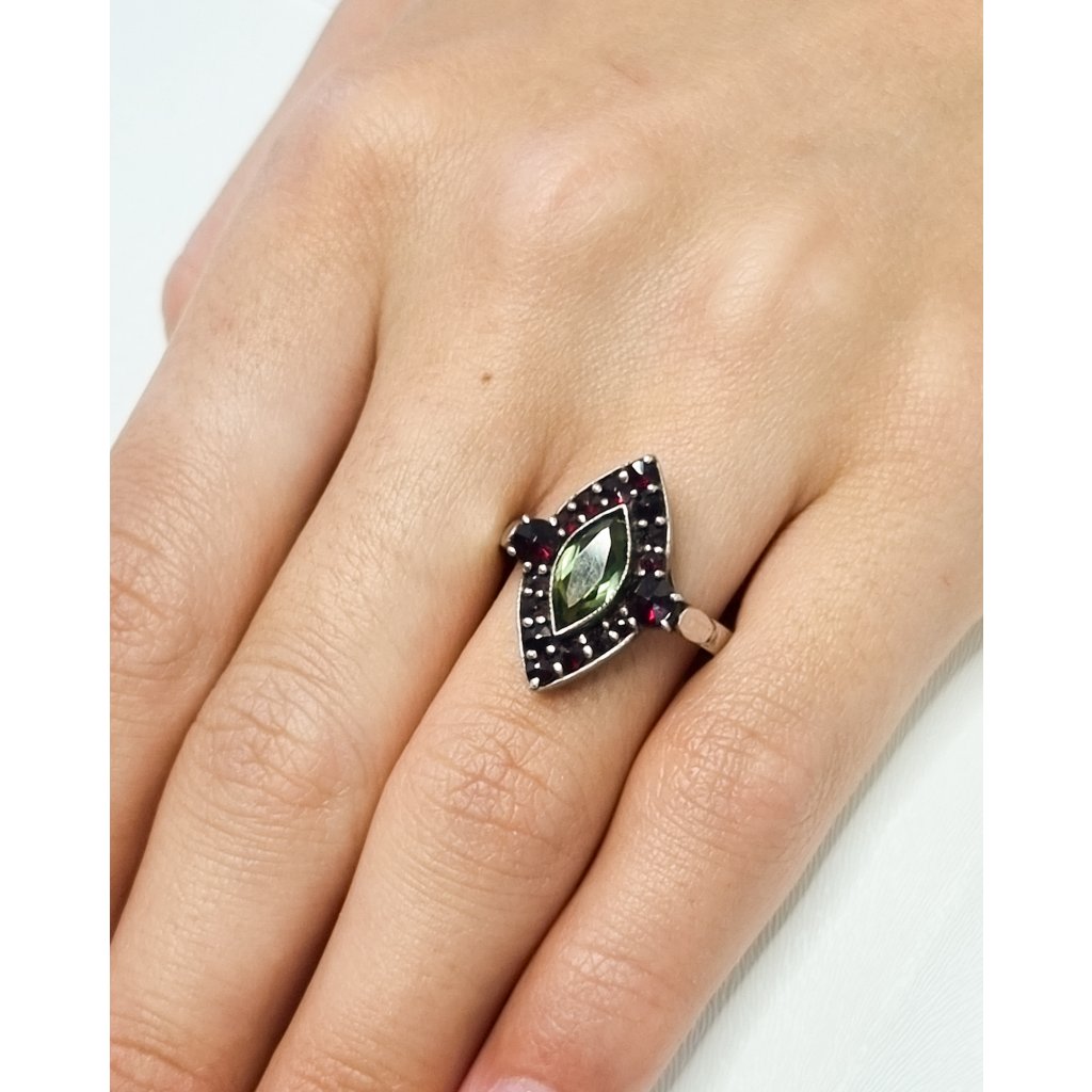 Stříbrný prsten s vltavínem a granáty P45 0007/55