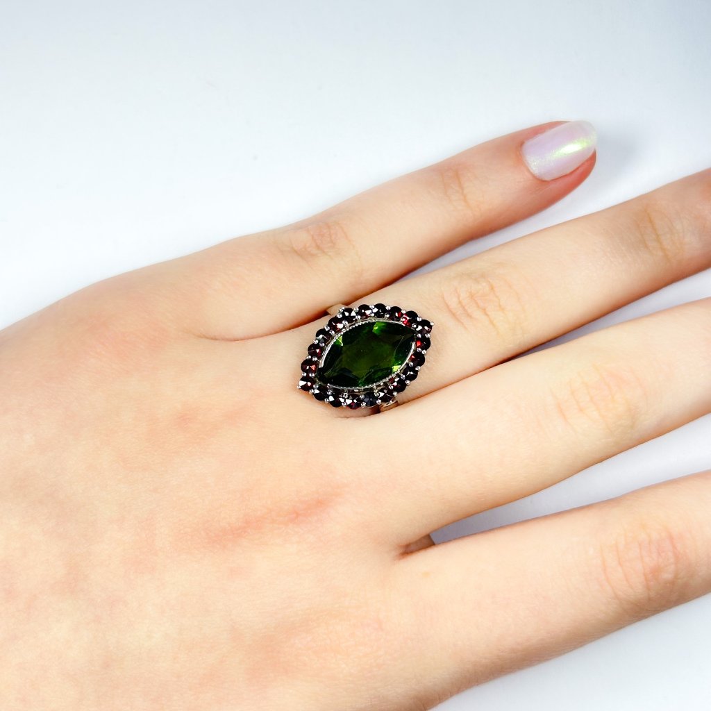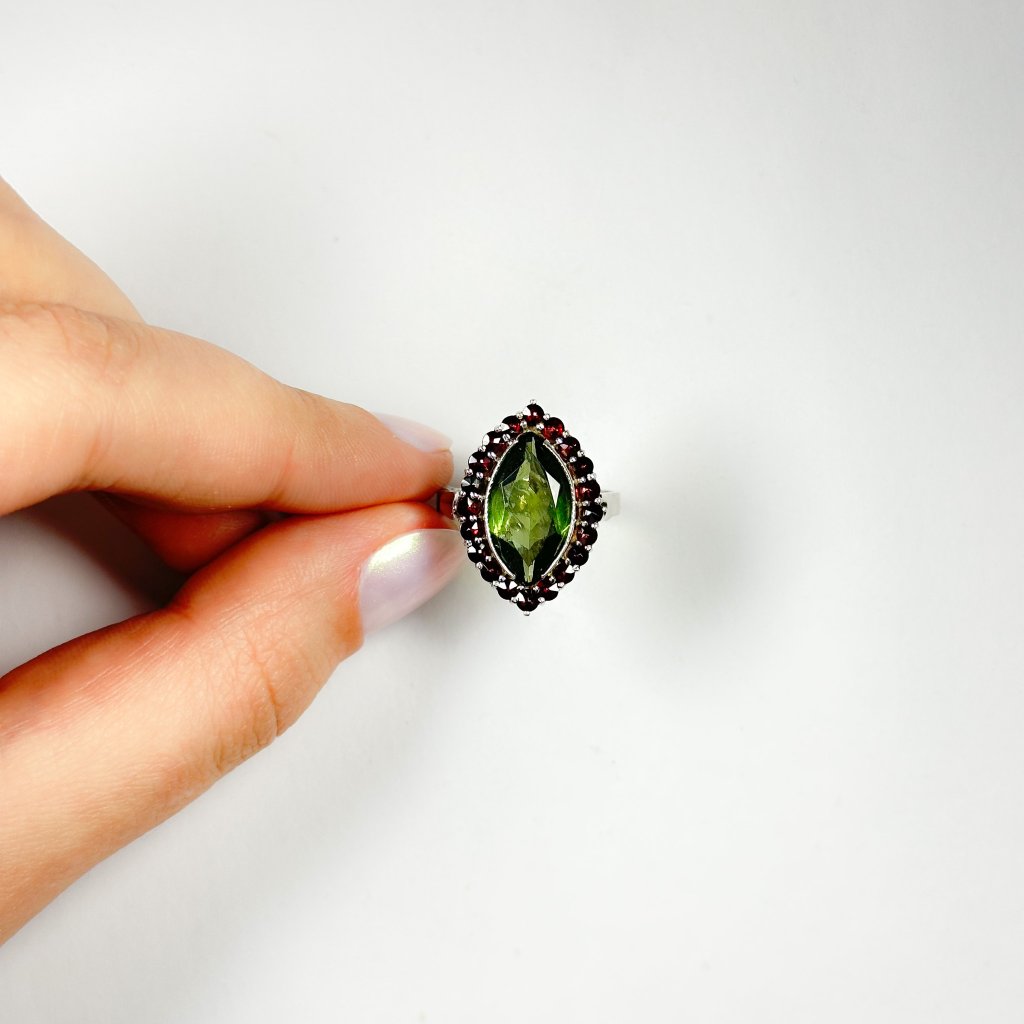 Stříbrný prsten s vltavínem a granáty P45 0024