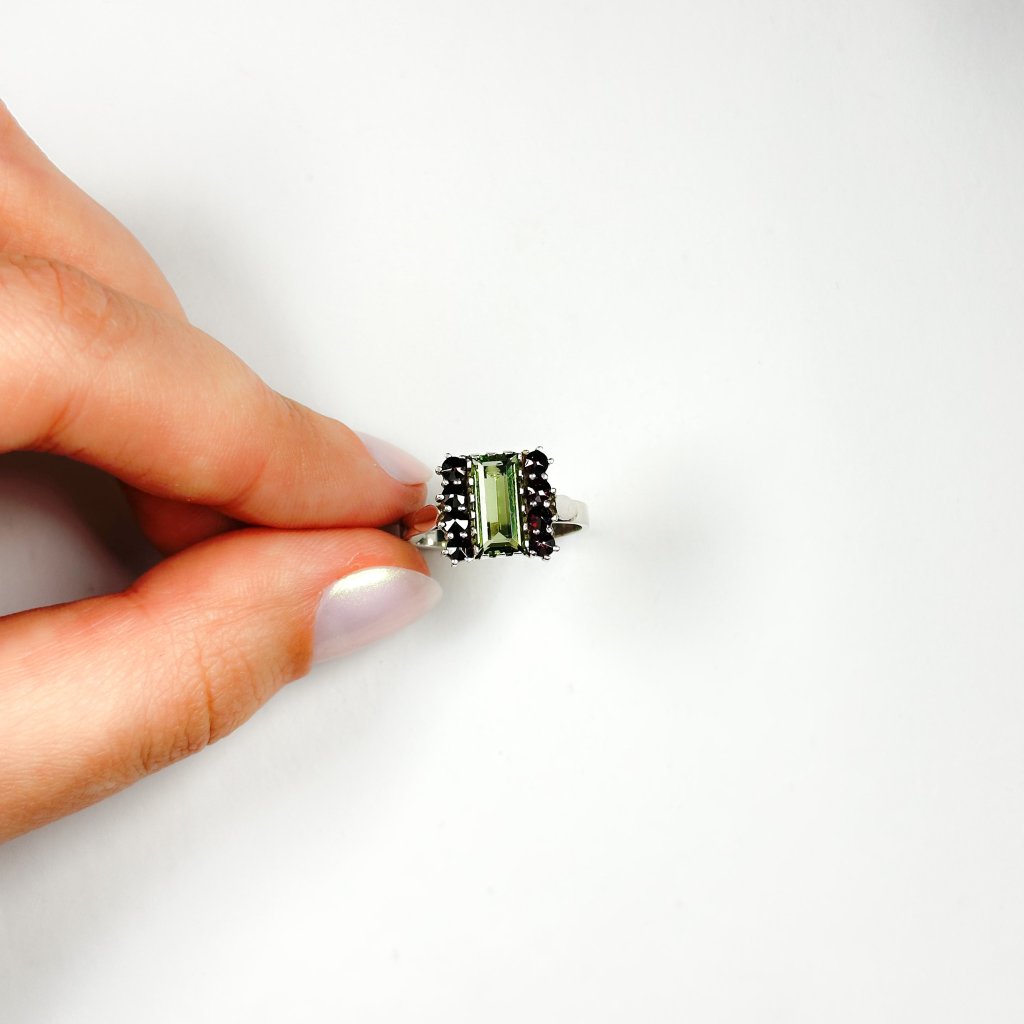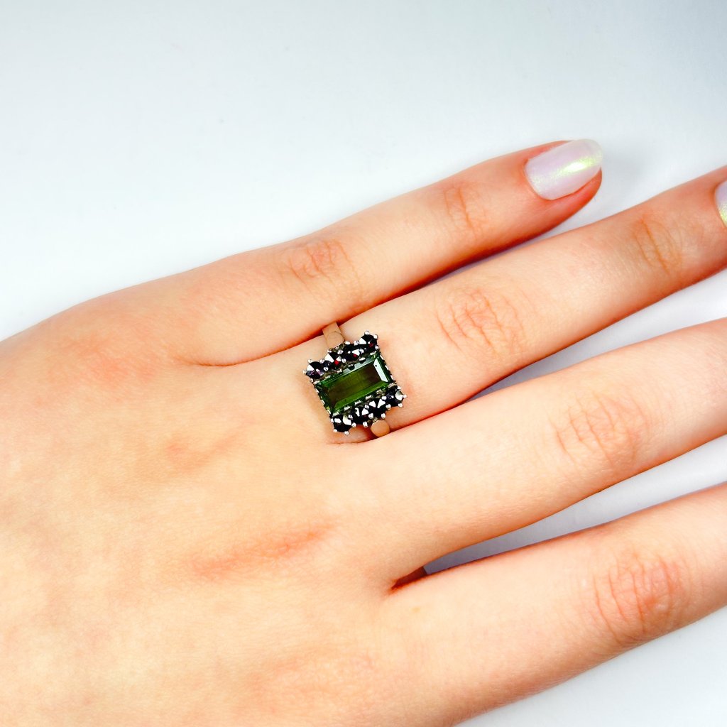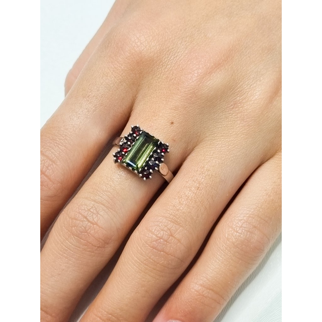 Stříbrný prsten s vltavínem a granáty P45 0025
