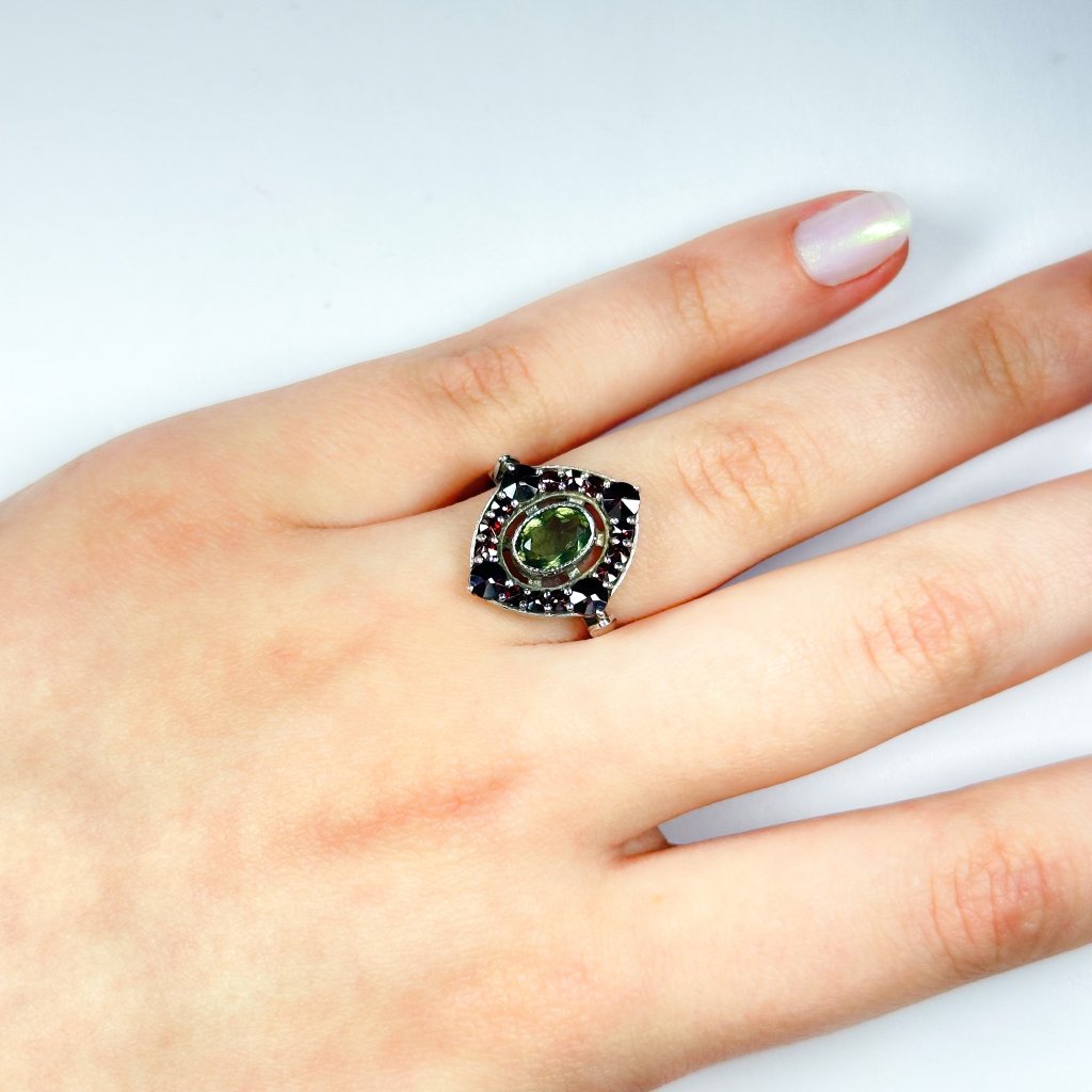 Stříbrný prsten s vltavínem a granáty P45 0028