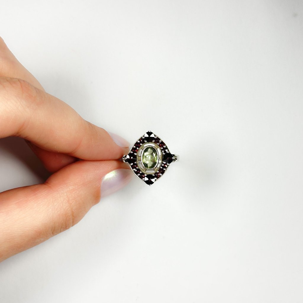 Stříbrný prsten s vltavínem a granáty P45 0028/56