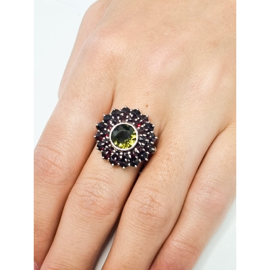 Stříbrný prsten s vltavínem a granáty P45 0032