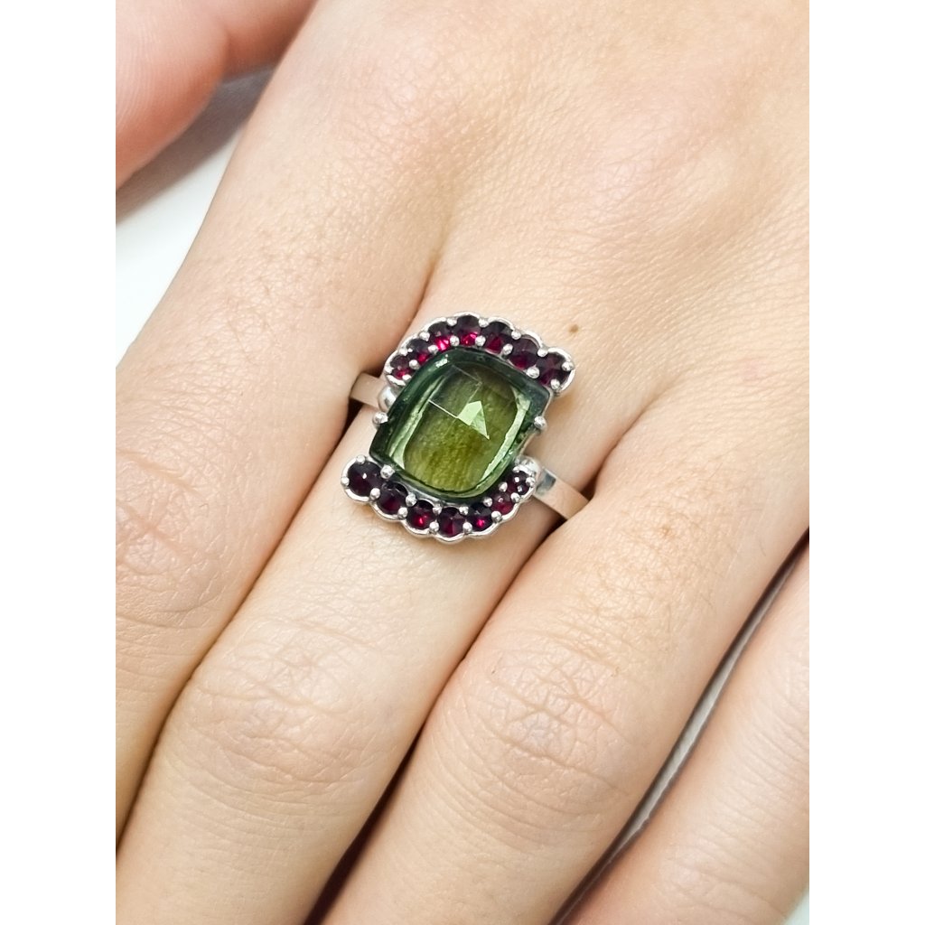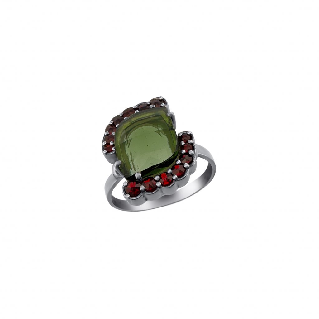 Stříbrný prsten s vltavínem a granáty P45 0035