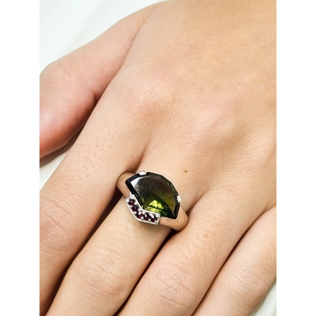 Stříbrný unisex prsten s vltavínem a granáty P45 0040