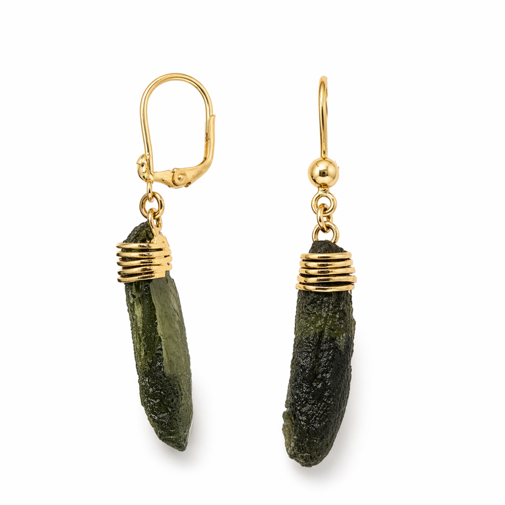 Zlaté visací náušnice s vltavínem z jednoho kamene – dokonalý pár z přírody