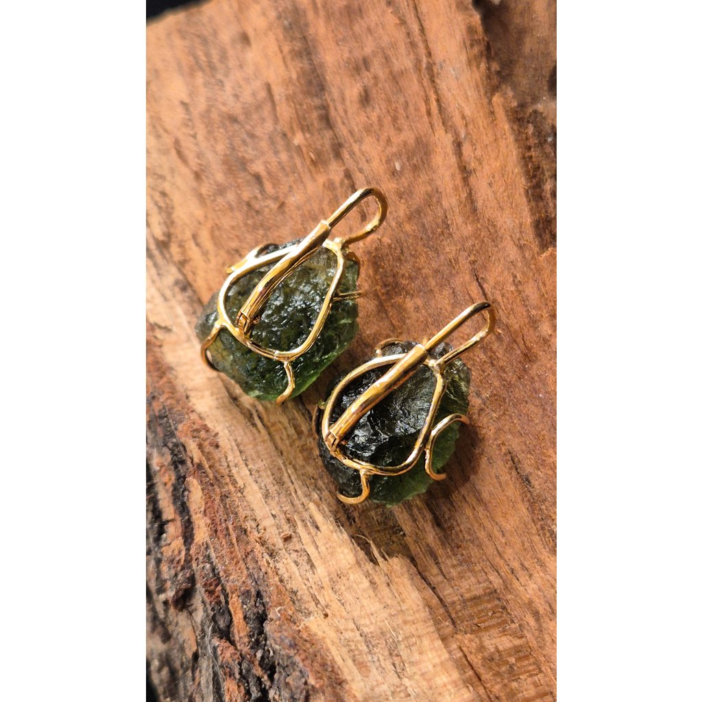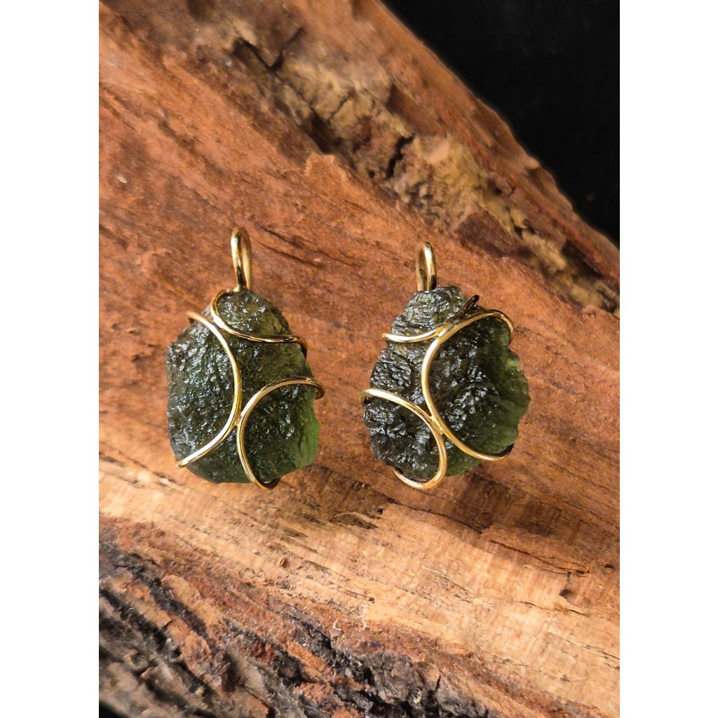 Zlaté náušnice s přírodními, nebroušenými vltavíny – jedinečný doplněk. Každý z ních nese příběh českých lesů a řeky Vltavy. Elegantní design vytváří výrazný šperk pro každodenní i speciální příležitosti. Užijte si krásu přírodního šperku.