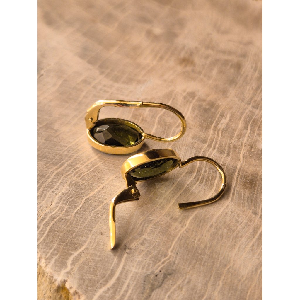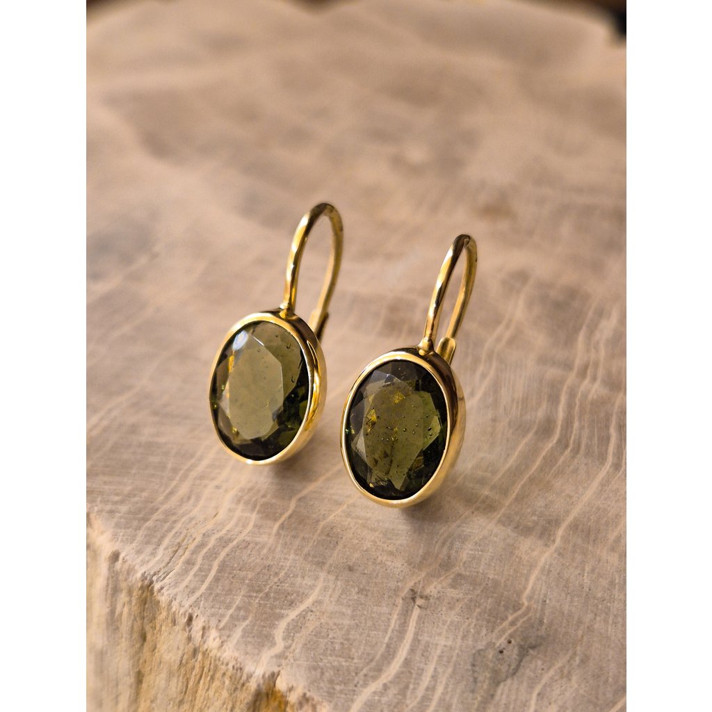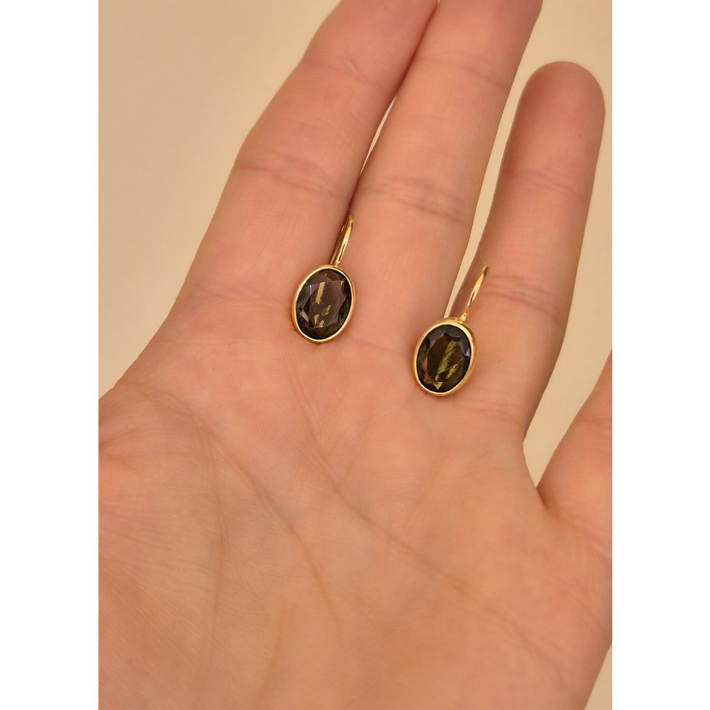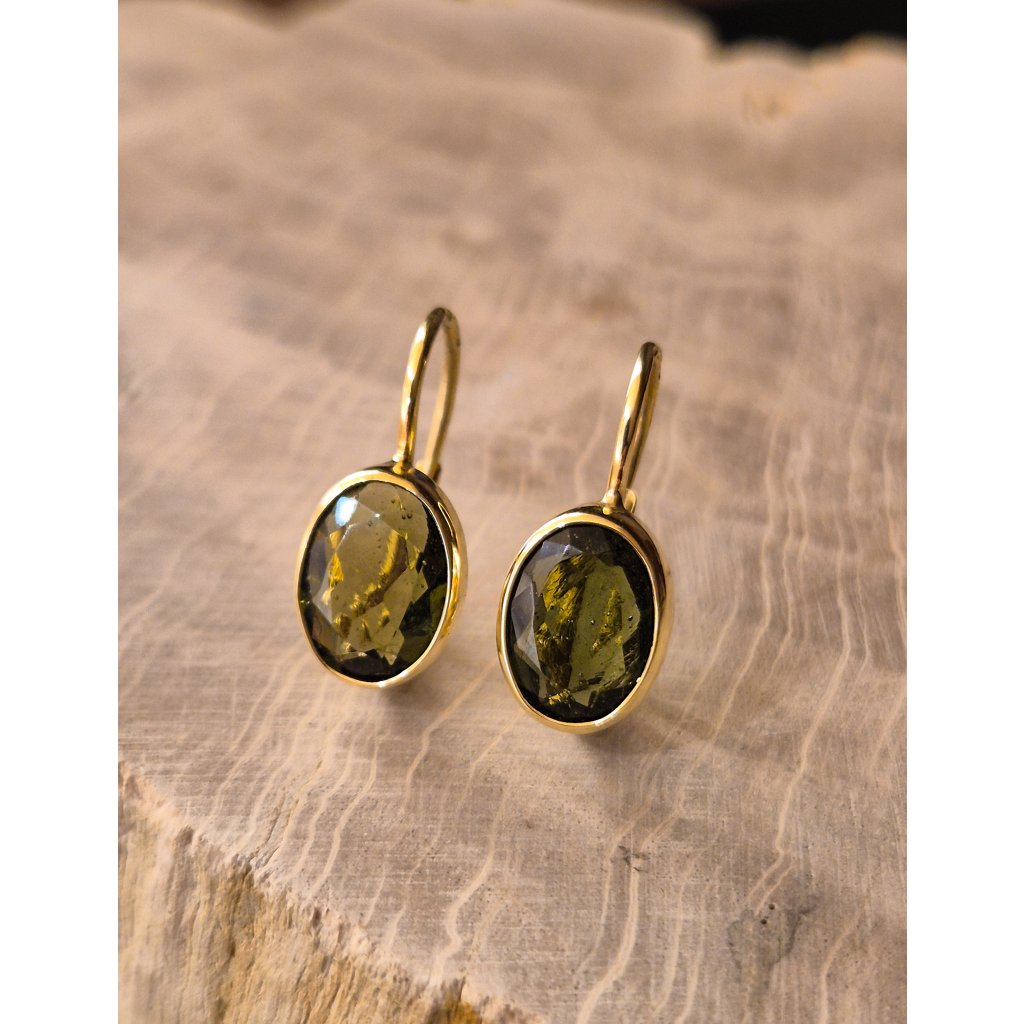 Zlaté náušnice ovál s broušeným vltavínem