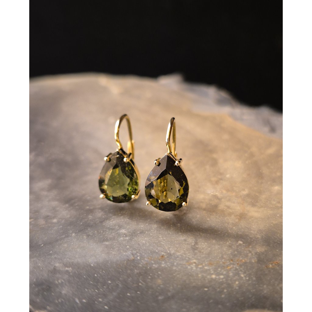 Zlaté náušnice s vltavínem ve tvaru kapek P20 0156