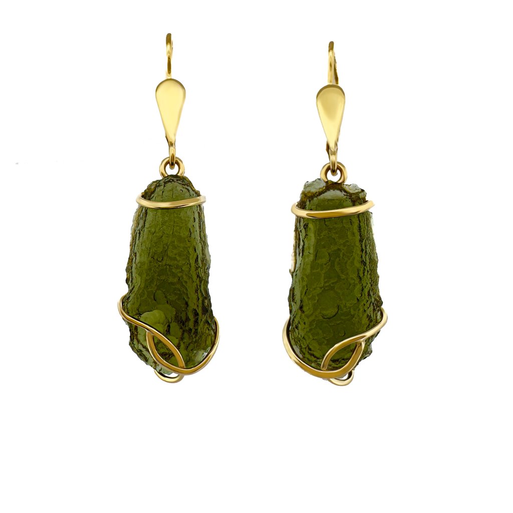 Neopracované vltavíny jsme zasadili do 14ti karátového zlata. Kámen je pevně uchycen ze všech stran. Tyto visací náušnice jsou vhodné ke všem příležitostem i těch slavnostních! Pevné zapínání je samozřejmostí (klasický dámský patent)!