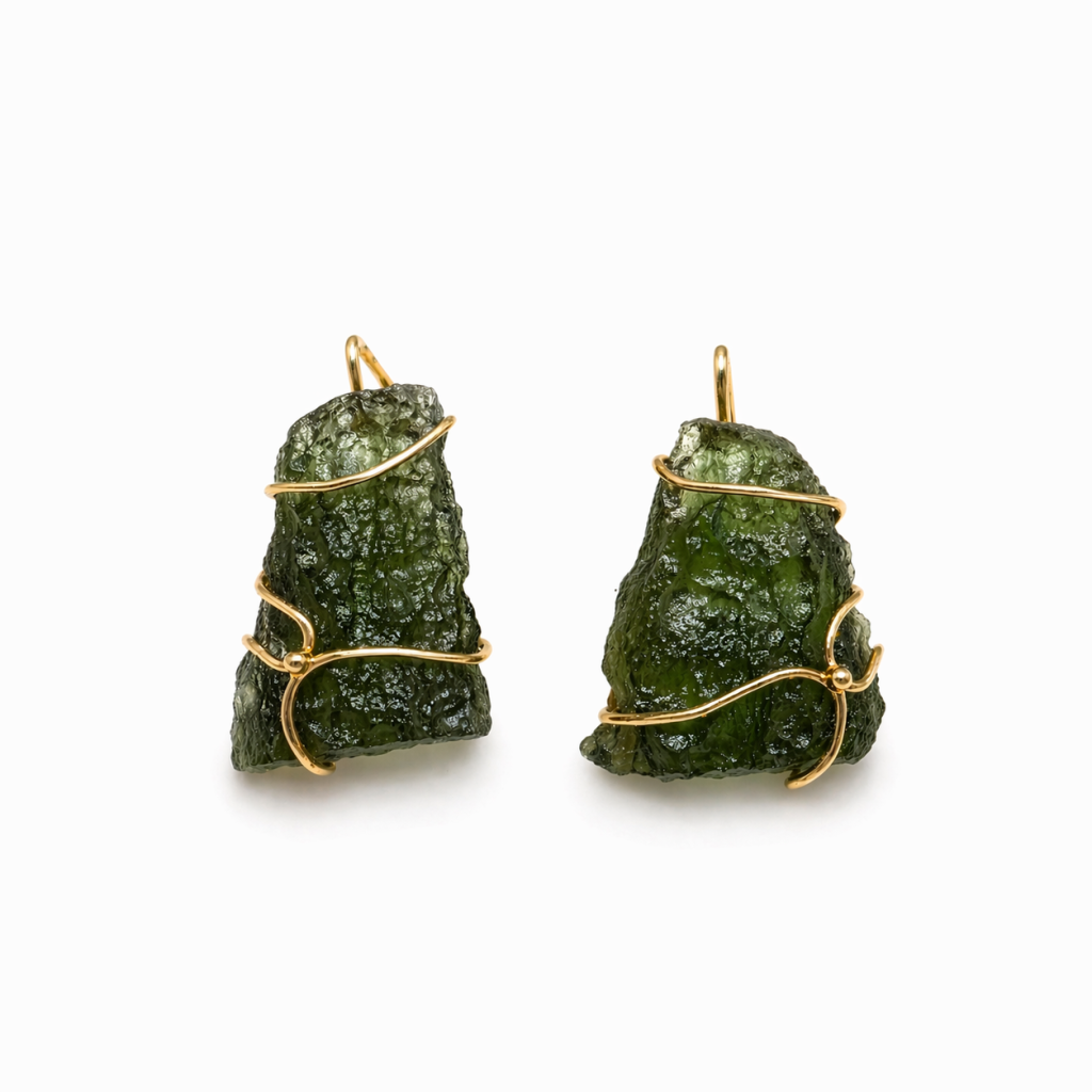 Tyto zlaté náušnice zaujmou svou přirozenou silou a jedinečným charakterem. Dominantou jsou větší kusy pravého vltavínu v neopracované podobě, které si zachovávají svou typickou plastickou strukturu, jemné detaily a hluboký zelený odstín.