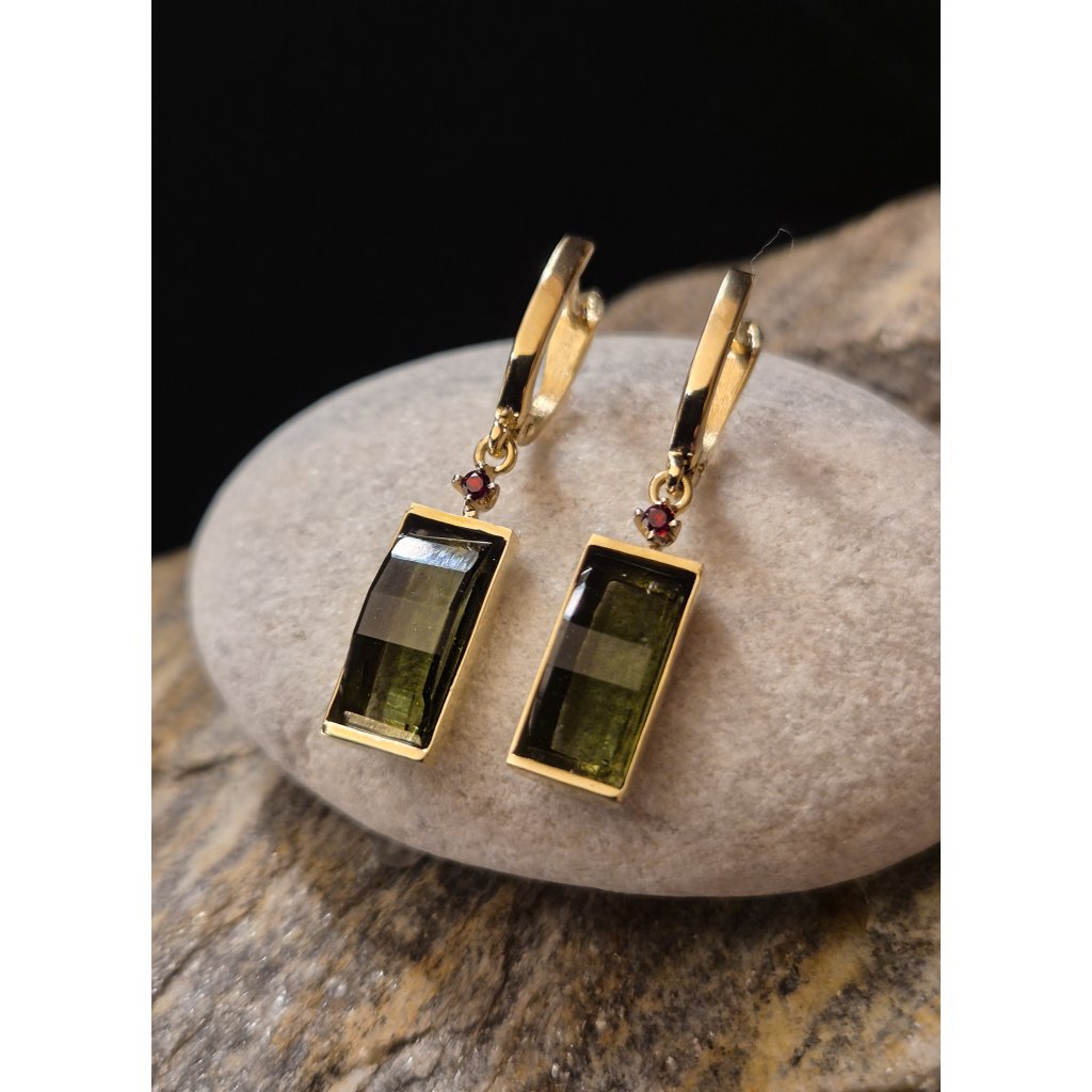 Zlaté visací náušnice s vltavíny a granáty P20 0157