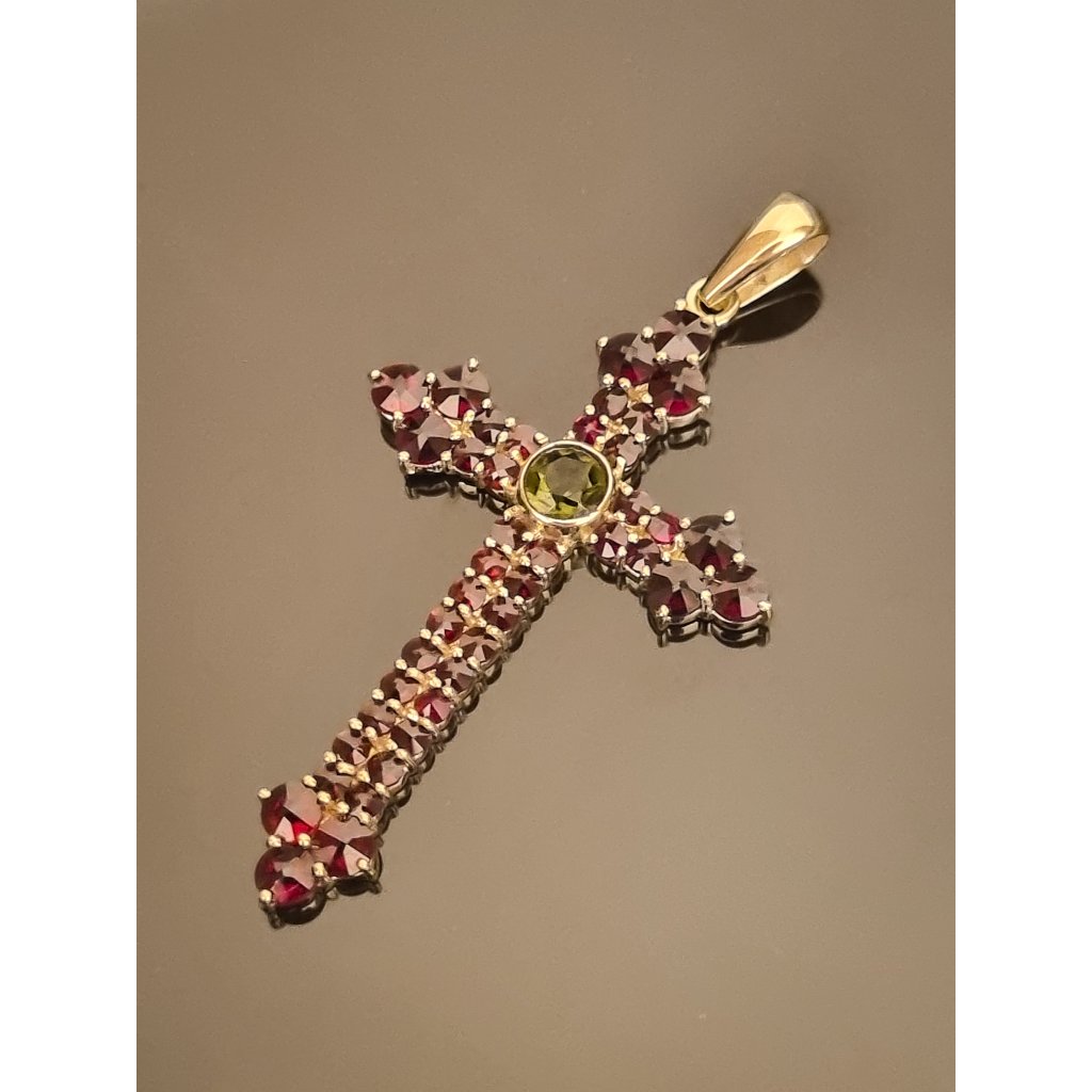 Zlatý přívěsek kříž s vltavínem a granáty P21 0046