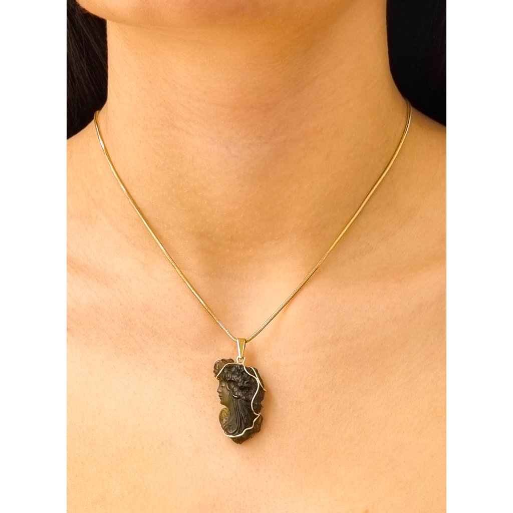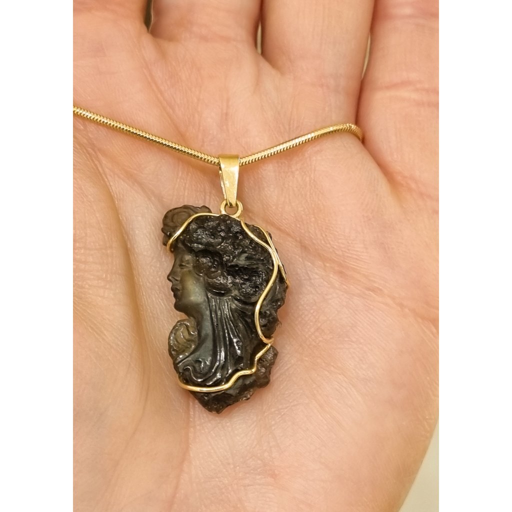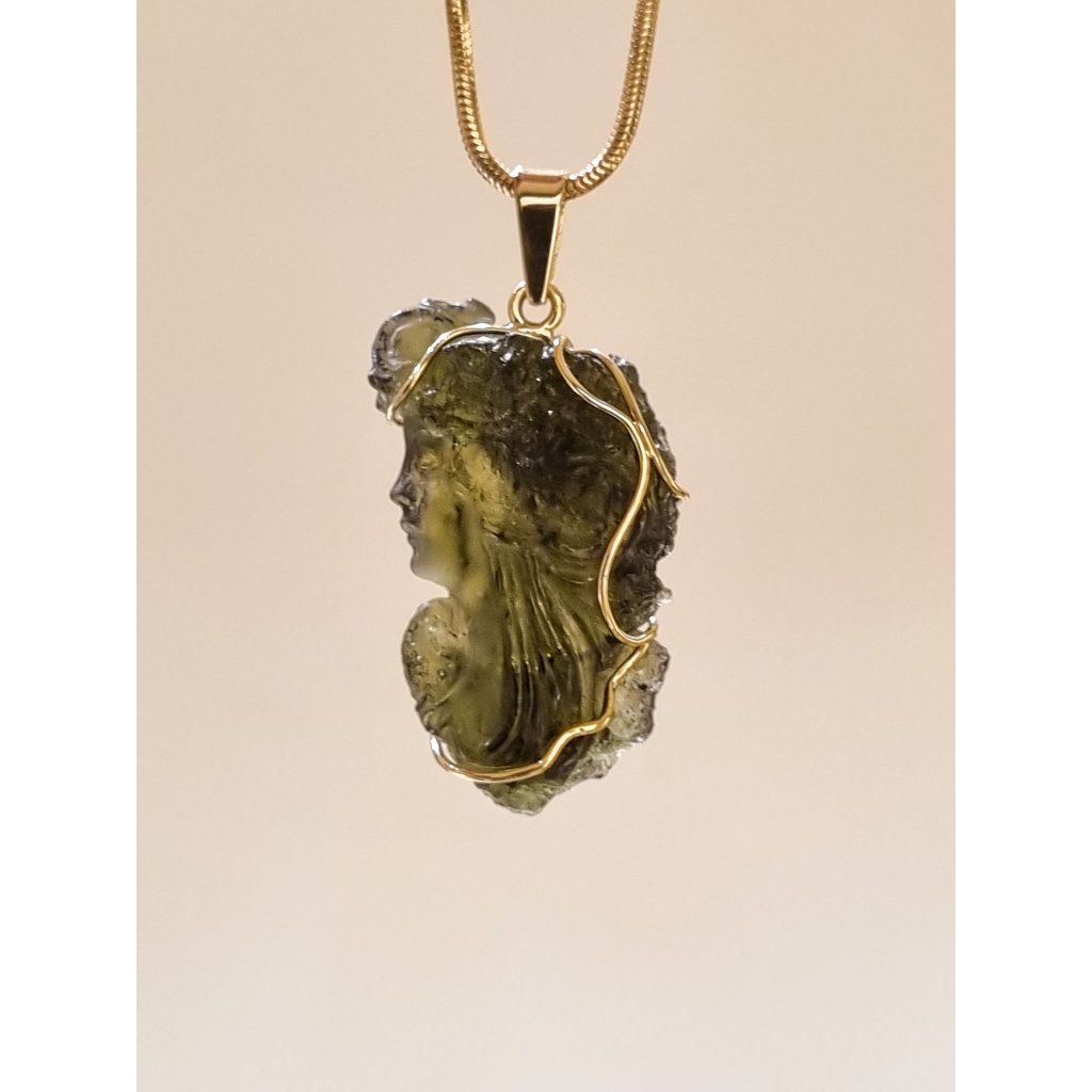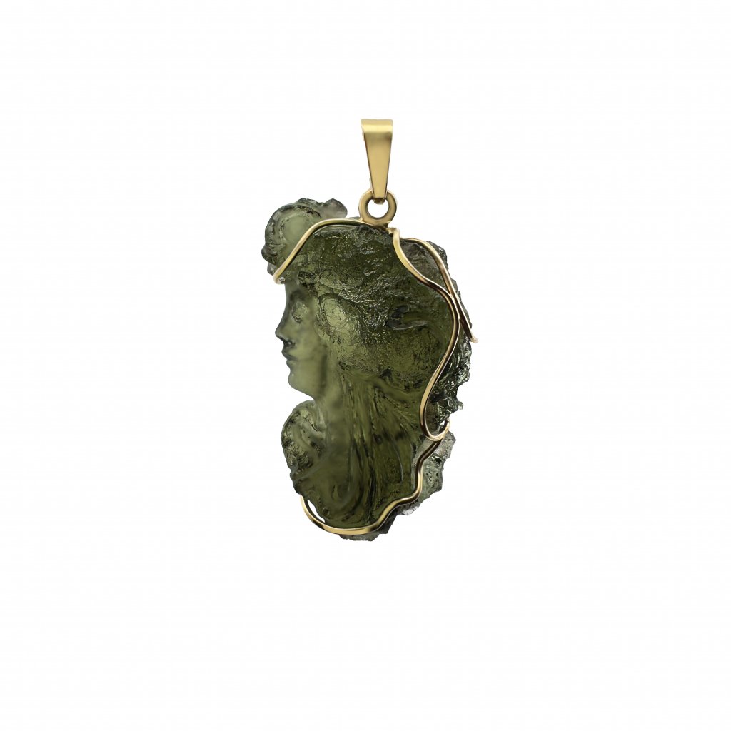 Zlatý přívěsek s vltavínem, glyptika, profil obličeje ženy P25 0029