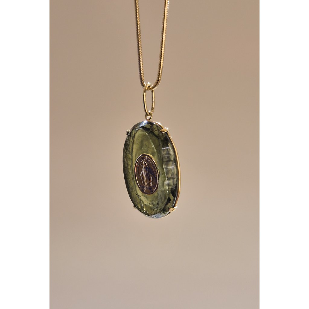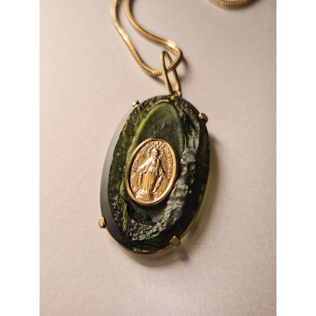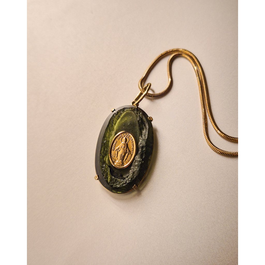 Tento zlatý přívěsek je vytvořen pro ty z Vás, kteří hledají výjimečnost i poselství. Synergie vltavínu a motivu Panny Marie vytváří šperk s hlubokou energií.