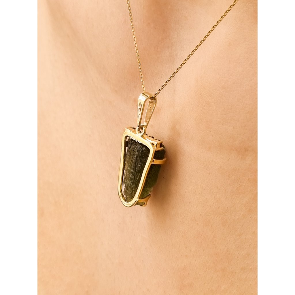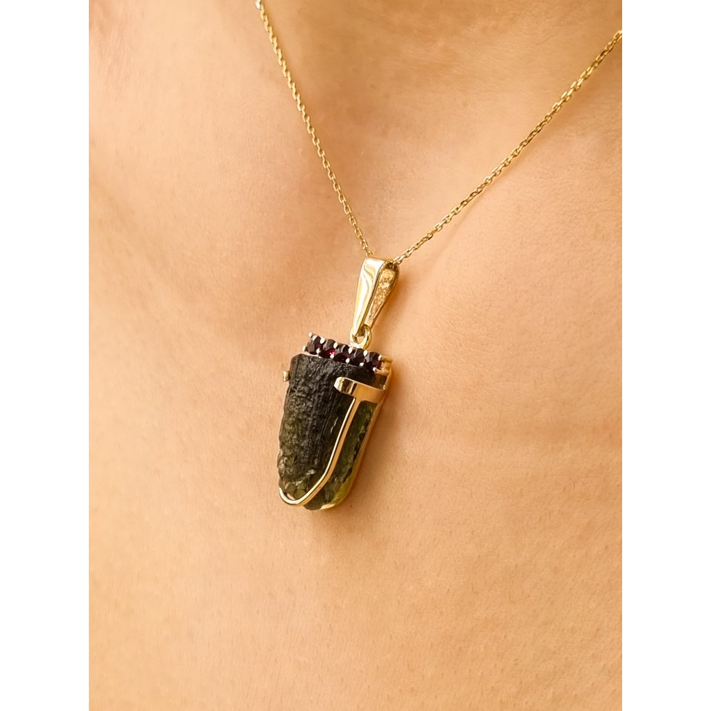 Zlatý přívěsek s vltavínem, kde granáty elegantně lemují horní část, vytváří jemný rafinovaný šperk.Kombinace zlaté a tmavě červené přináší do šperku bohatost a výraznost, zatímco zelený vltavín dodává unikátní nádech přírodní krásy. Tento klenot je vkusným doplňkem pro ty, kteří ocení spojení noblesy a přírodního šarmu.