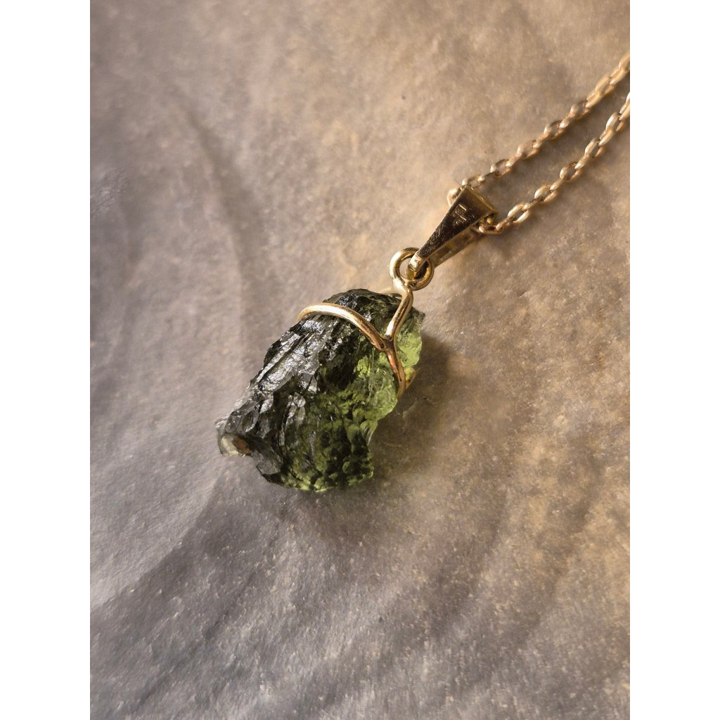 Neopracovaný vltavín zůstává nedotčený časem i rukou brusiče. Ve zlatém rámu působí divoce a přitom harmonicky.