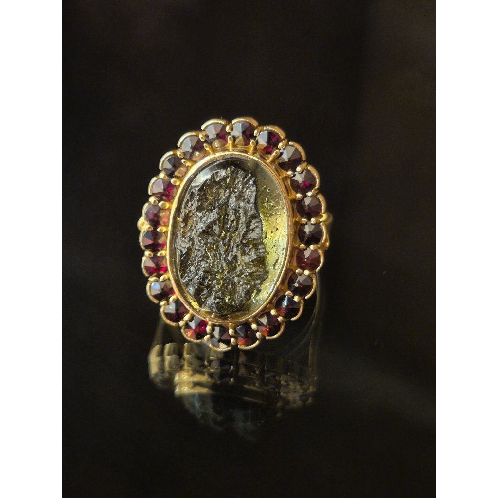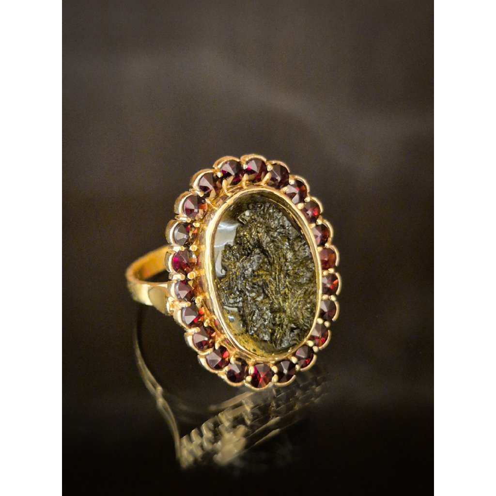 Luxus s příběhem – vltavín, zasazený do ušlechtilého zlata, obklopený zářícími granáty, tvoří jedinečný šperk.