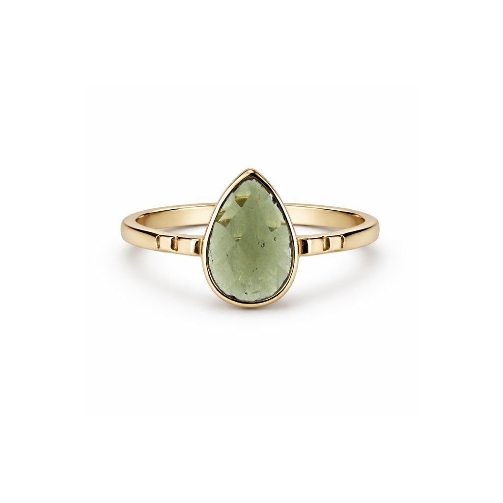 Zlatý masivní prsten s broušeným vltavínem ve tvaru kapky