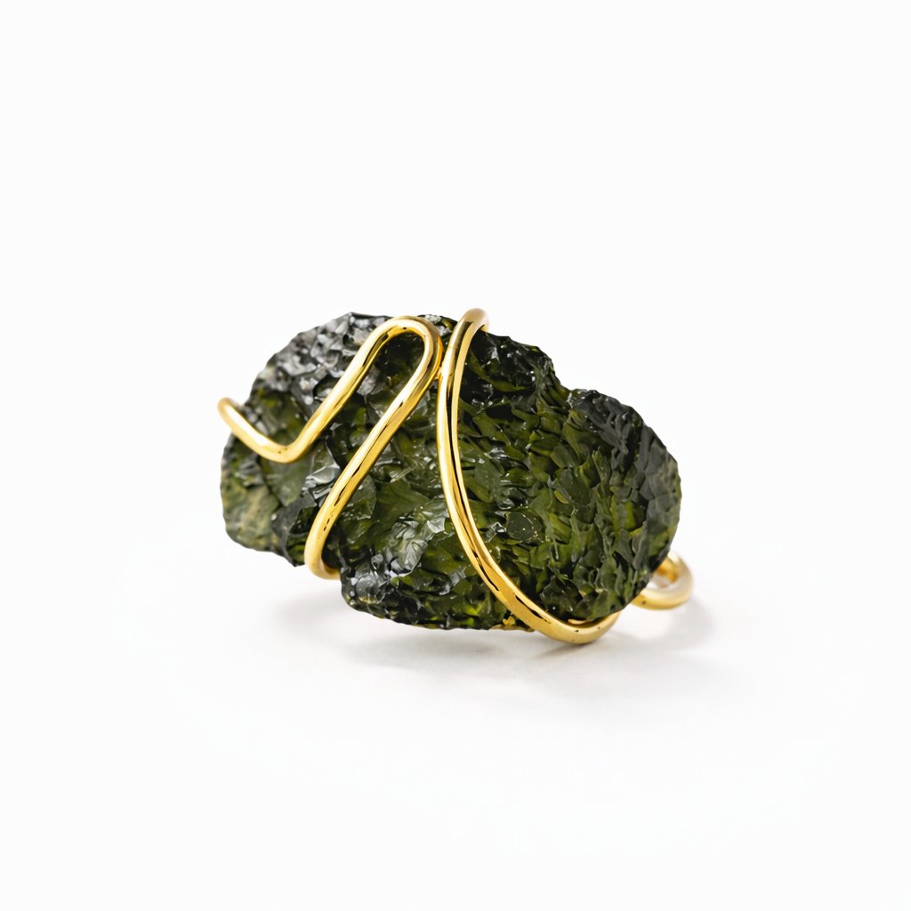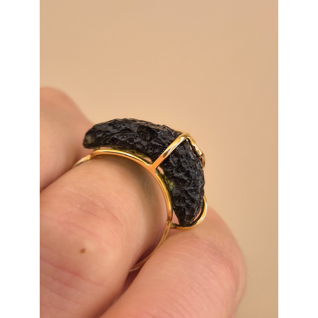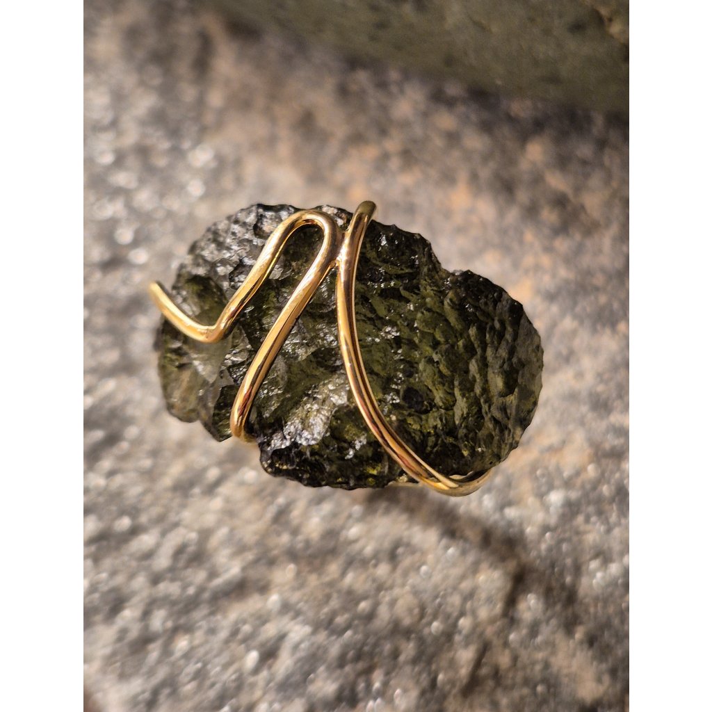 Tento prsten spojuje luxus zlata s divokostí přírodního kamene. Neopracovaný vltavín působí syrově, a přesto nesmírně elegantně.