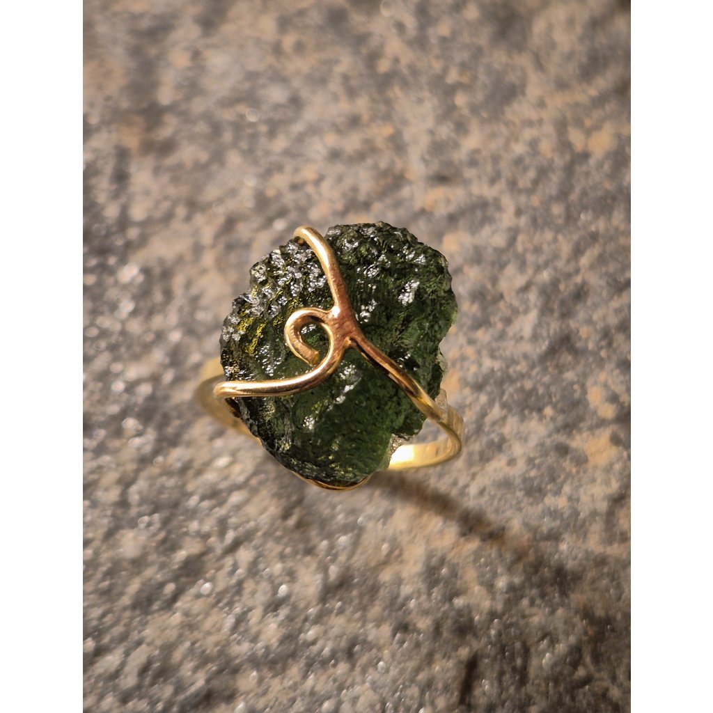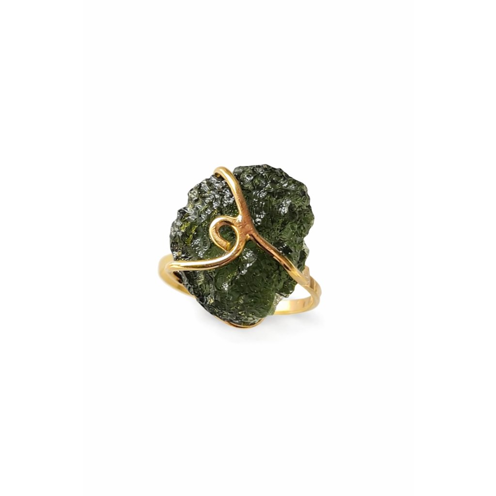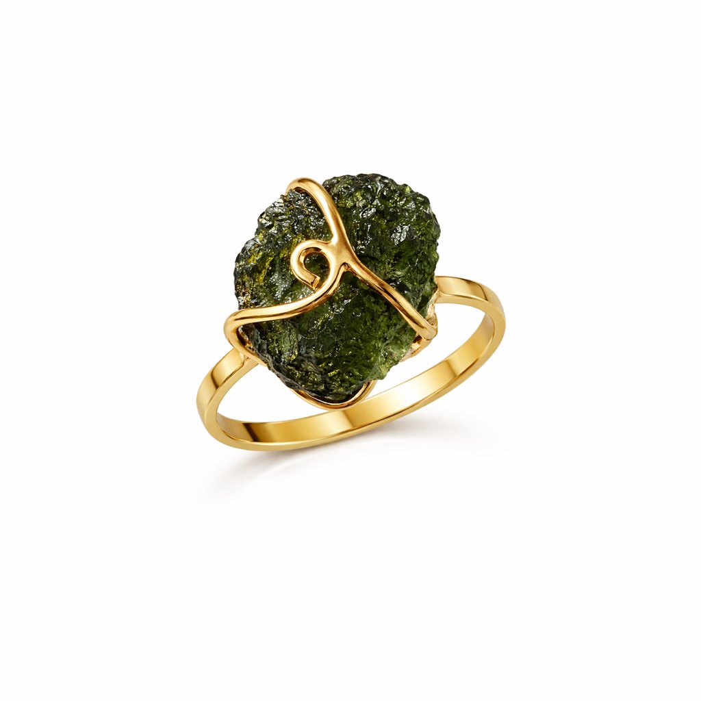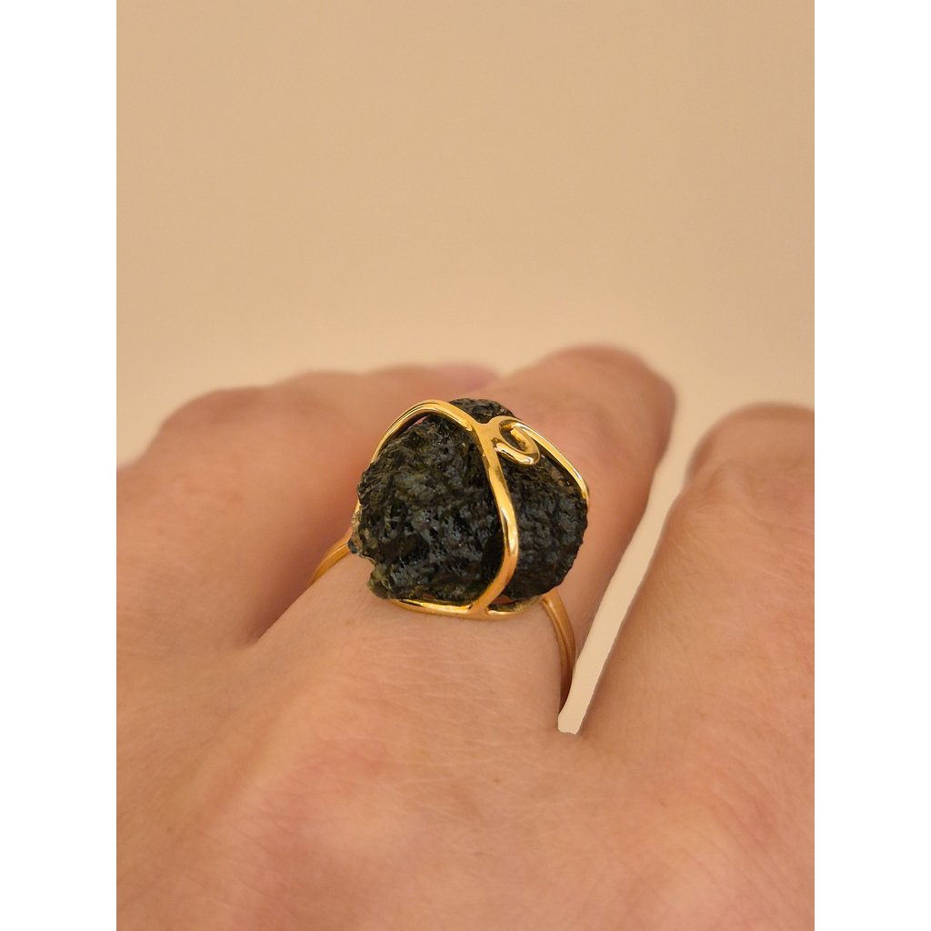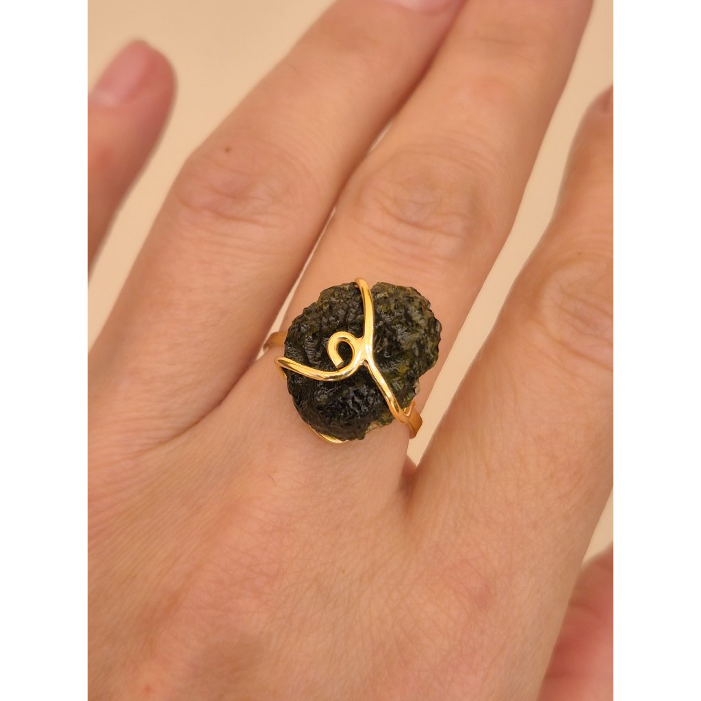 Vltavín ve své původní podobě září v kontrastu se zlatem. Každý kus je originální, stejně jako Vy.