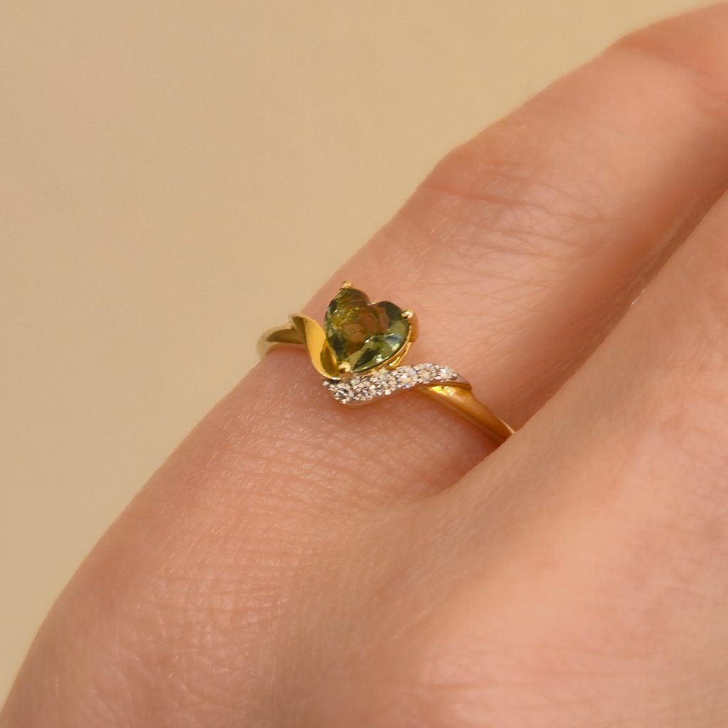 Zlatý prsten s vltavínem ve tvaru srdce s diamanty 18075